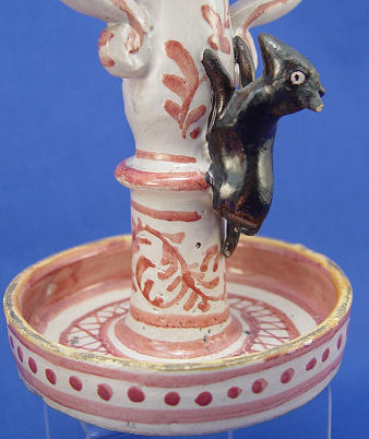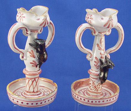 PAIR OF ITALIAN MAJOLICA STICK OIL LAMPS: Lume Ad Olio. Oil floats in the top, the wick rests across the spout type rim. Applied rat or mouse decoration. 8''h.