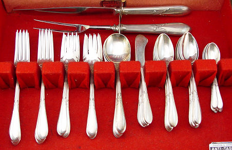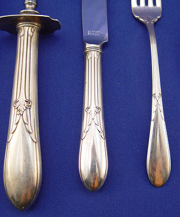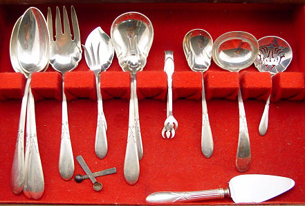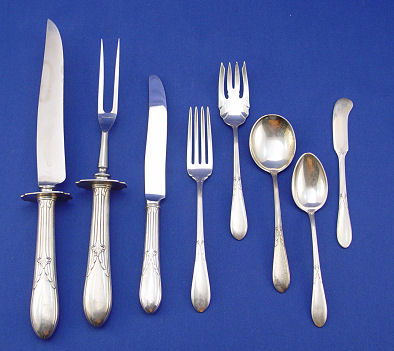GORHAM STERLING ''ROSE MARIE'', SERVICE FOR 8: To include, dinner knives 9'', dinner forks 7 1/4'', salad forks 6 5/8'', cream spoons 6 1/4'', flat butter knives 5 3/4'', demitasse 4 1/4'', 16 teaspoons 6'', carving set - fork 10 1/2'' knife 12'', 3 serving spoons 8 1/2'', meat fork 8 1/8'', sugar spoon 6'', sugar tongs 4'', jelly server 6 1/4'', bonbon spoon 4 3/4'', gravy ladle 6 1/2'', short handled pickle or olive fork 5 7/8'', salad serving spoon 7 3/8'', cheese server 6 5/8'', lemon fork 4 1/4''. 79 pieces, no monogram, sold as a lot in a double layer wooden silver box.