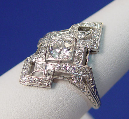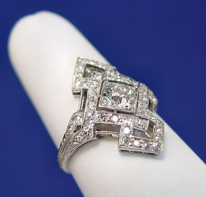 PERIOD PLATINUM DECO DIAMOND RING: Delightful deco ring centered by an approx. 1/2ct Euro cut diamond, near colorless, VS clarity, surrounded by 60 micro bead set small diamonds. Etched design to shoulders, unmarked assays platinum, size 7.5, 4.2 grams. Est. $3000/4000**