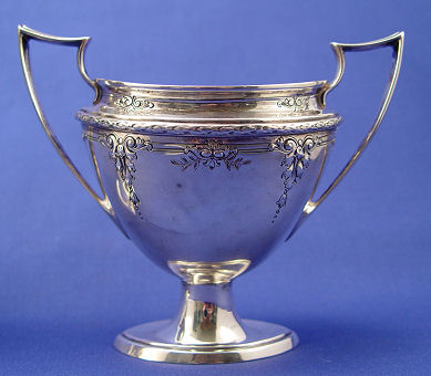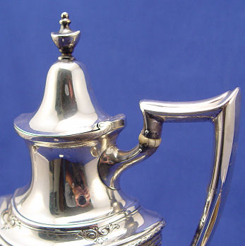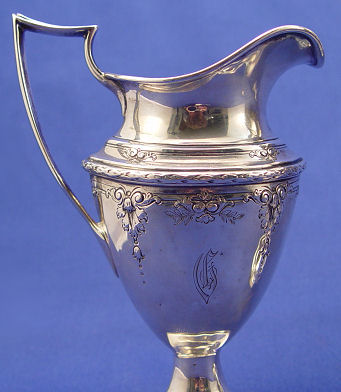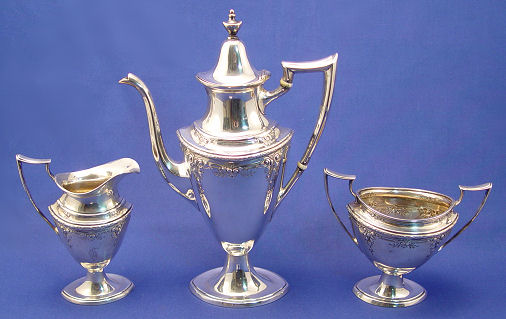DOMINICK & HAFF STERLING COFFEE OR TEA SERVICE: 3 piece set includes pot, open sugar and creamer. Petite set embossed with bellflower and swag design. Hinged lid on the pot, 11''h. Monogrammed. Please call for condition. Approx. 25.65 0z. 798 grams.