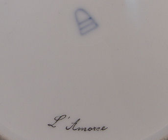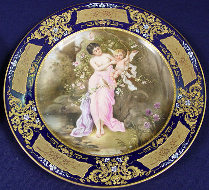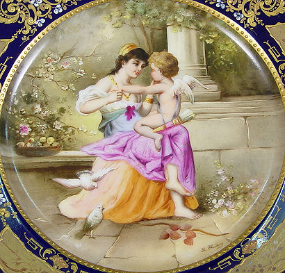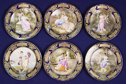 SET OF 6 ROYAL VIENNA CABINET PLATES: Each hand decorated with a woman engaged in leisure with cupid Amor. The plates are signed R. Hober, some are Heer. The titles are 1) Amor als Fischer 2) Du Schelm! 3) Nimphe und Amor 4) Verfangliche Frage 5) L' Amorce 6) Hor mich an! All plates have ornate gilt and enamel rim on cobalt. Blue beehive mark under glaze. 9'' dia. Free of chips, cracks or repairs.