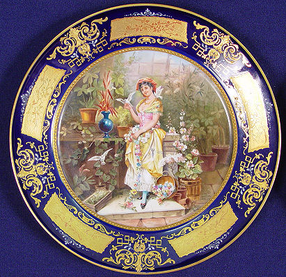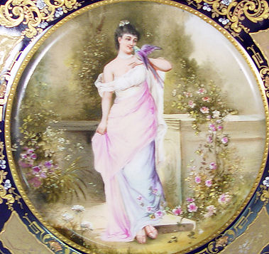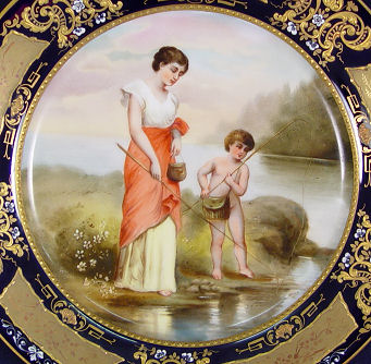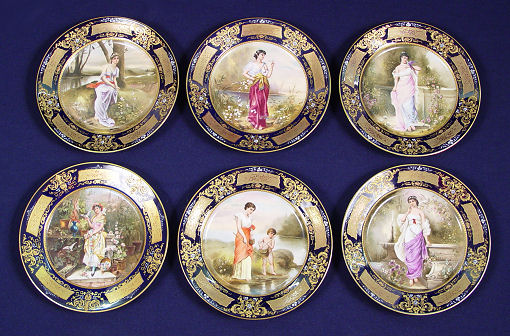SET OF 6 ROYAL VIENNA CABINET PLATES: Each hand decorated with a pensive beauty with a bird, child fishing or just enjoying the solitude. The plates are signed are Heer, one is R. Hober. The titles are 1) Libellen 2) Das Lied 3) Das lachelnde Taubchen 4) L' Amour s'en mele 5) Lieberahmung 6) En Kusschen. All plates have ornate gilt and enamel rim on cobalt. Blue beehive mark under glaze. 9'' dia. Free of chips, cracks or repairs.