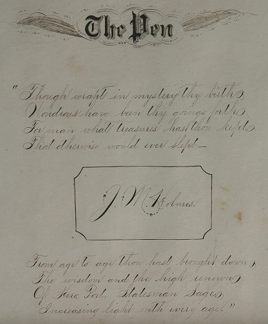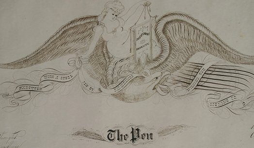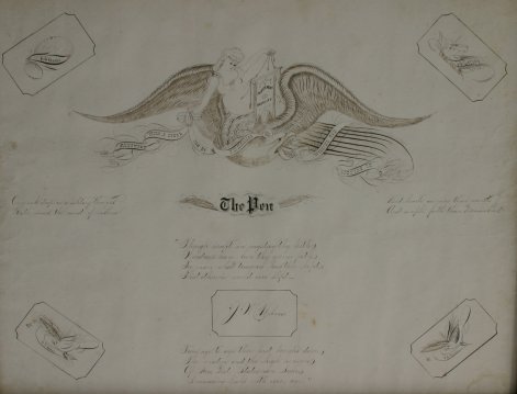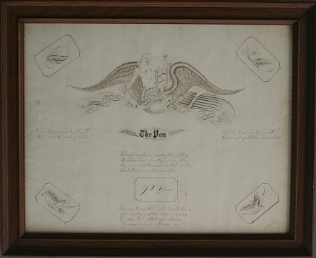 HOLMES, J.H., (American, 1812-?): Depicts a large swept eagle with Miss Liberty on his back holding a plaque inscribed ''Freedom'' ''Prosperity''. In her right hand she holds an unfurled banner with the inscriptions ''Executed with a steel pen by J.H.Holmes'' and ''Wilkins run licking Co.O'' verse titled ''The Pen'' with two verses. Also inscribed on the left side is the quote ''One ink drop on a solitary thought hath moved the mind of millions''. Quote on the right side reads ''Kind hearts are more than coronets and simple faith more than Norman Blood''. In each corner is the likeness of a calling card embellished with birds, upper left card honors R.B.Hayes, upper right card honors J.A.Garfield, lower left card pays tribute to D.T.Ames and the lower right card pays tribute to P.R.Spencer. P.R. Spencer was given credit for introducing and promoting calligraphy drawings, therefore, they are often referred to as ''Spencerian drawings. Calligraphy, worked in brown ink. measures 22 1/2'' x 17 1/2''. One