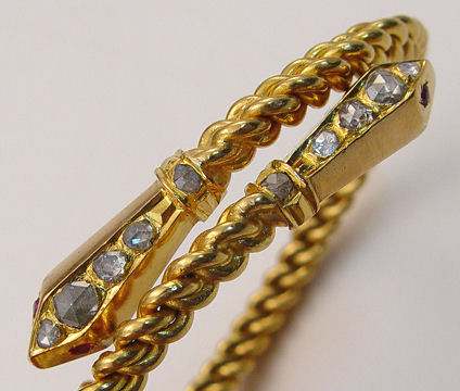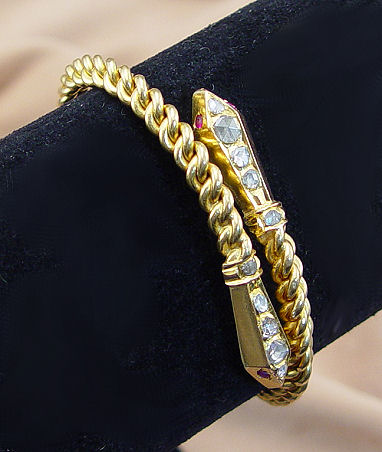 C 1840's GOLD & DIAMOND SNAKE BRACELET: Wonderful twisted chain cuff bracelet with bypassing snake head ends set with ruby eyes and rose cut diamonds. Five diamonds to each head ranging in measurement approx. 2.5 to 4.2mm dia. India's Hydraba Valley a suggested origin. Assays 22k, deep yellow gold, approx. 59.9 grams.