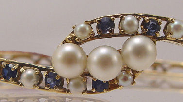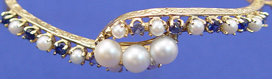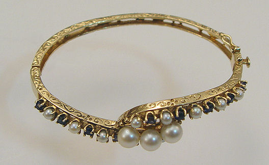 SAPPHIRE & PEARL BYPASS BRACELET: 14k yellow gold open bangle bracelet with etch work to sides topped by alternating prong set pearls and sapphires curving around three larger pearls. Sapphires measure approx. 3mm x 2mm, pearls are 3.2mm and 6mm, delicate hinge with possible previous repair, opening approx. 1 7/8'' x 2 3/8'', pressure clasp with safety latch, approx. 14 grams.