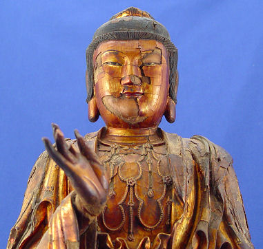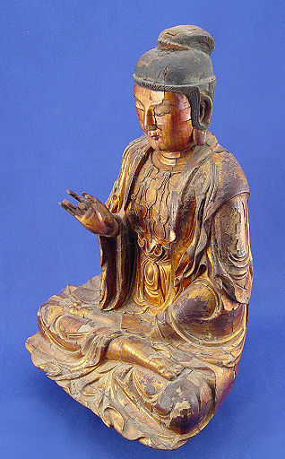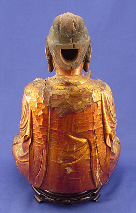 CARVED GILT WOOD QUAN YIN TEMPLE FIGURE: Remnants of gold finish, 14'' h.
