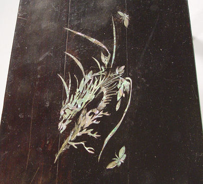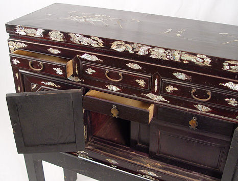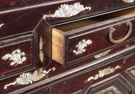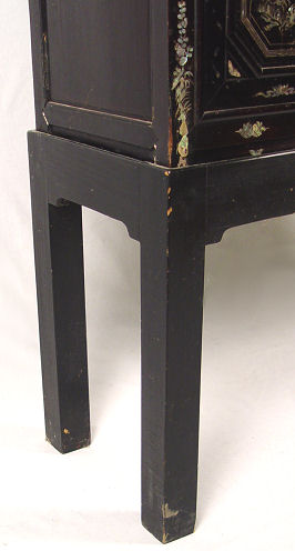 JAPANESE TANSU CHEST ON STAND INLAID WITH MOTHER OF PEARL: Ebonized and carved wood with four upper drawers with bale handles over paneled sliding hinged doors, the stand with straight squared legs. 36''h. x 39 1/2'' x 14''.