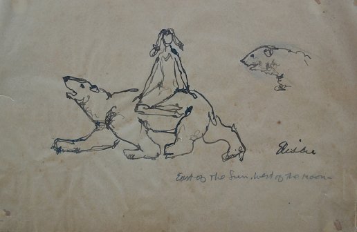 ELISCU, Frank, (American, 1912-1996): Female Figure Riding Bear, Ink Sketch Drawing, 7'' x 10 3/4'', SLR, titled, ''East of the Sun, West of the Moon''. Famous artist of the Heisman Trophy.