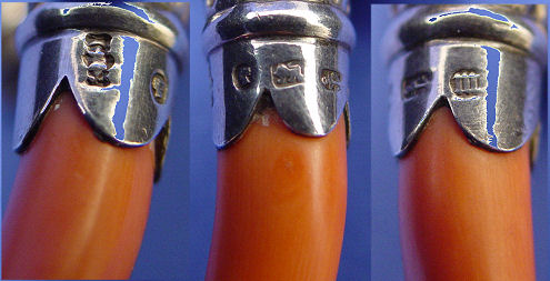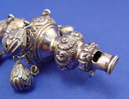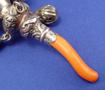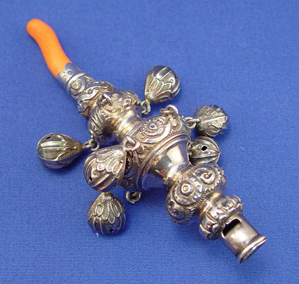 ENGLISH VICTORIAN STERLING BABY RATTLE, WHISTLE AND CORAL TEETHER: Three tier toy, whistle, bell rattle and red coral teether with ring for ribbon. Missing 3 bells from rattle section. Marks by coral teether indicate Birmingham 1886 manufacture, maker mark illegible. Approx. 5''l, 56 grams overall.