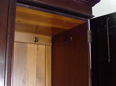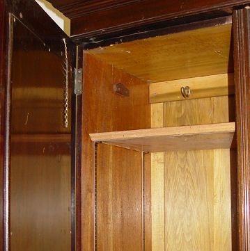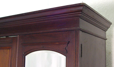 LATE 19TH CENTURY ARMOIRE: Beveled mirror on the door doors, carved center panel, 2 drawers across the bottom. Interior fitted with shelves. 83''h. x 60'' x 20''.