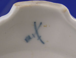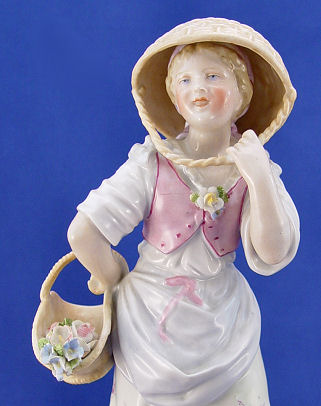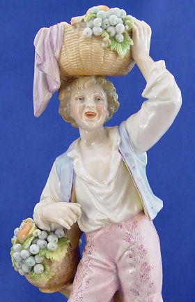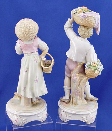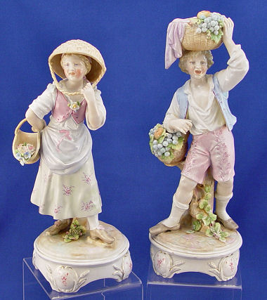 PAIR OF MEISSEN FIGURINES: A charming depiction of an expressive young boy and girl in 19th century costume out to gather flowers and fruit, their woven baskets on arm and balanced on head. Finely detailed hand painting throughout with gilt trim along the base. Underglaze blue crossed swords mark. 10 and 11 1/4''h.