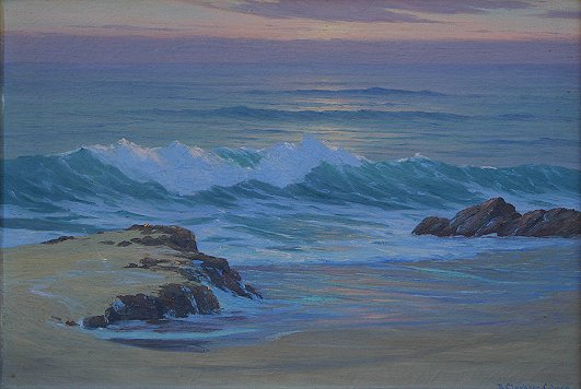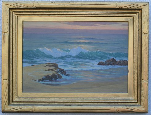 COLMAN, Roi Clarkson, (American, 1884-1945): ''And So The Day Ends'', O/C, 18'' x 26'', SLR, signed, titled and dated 1924, Laguna Beach, Calif. verso, carved period overpainted frame with minor wear, 27'' x 36 1/2''.