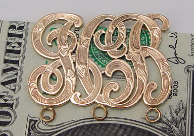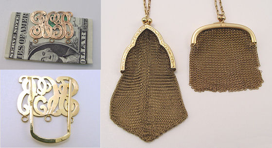 3 PIECE 14K GOLD LOT TO INCLUDE TWO COIN PURSES & A MONEY CLIP: a)Cathedral arch frame with etch work, mesh bag with pointed bottom, squared link chain handle, marked inside frame and on main link of handle, bag 1 1/4''w. x 3 1/4''l., plus 4'' handle. b)C frame with center monogram, mesh bag with flat bottom, small hole in mesh on right side, melded link handle with ring end, marked inside frame, bag 1 3/4''w. x 2''l. plus 4'' handle. c)Hausmann money clip or bookmark in shape of open work monogram LCB?, marked Hausmann Inc NOLA 14k, approx. 1 1/4'' x 1''. 52grams total for all three pieces, sold as a lot.