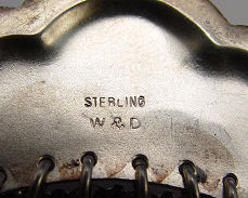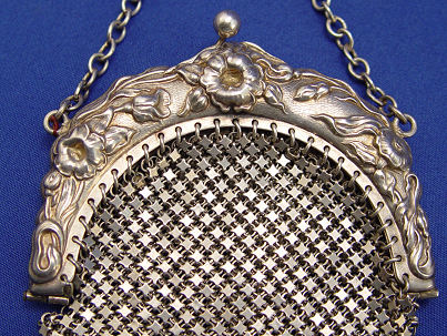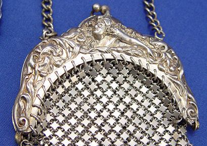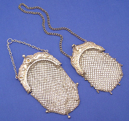 TWO EMBOSSED FRAMED STERLING MESH LINK PURSES, WHITING & DAVIS AND C.B.&L?: Whiting & Davis art nouveau embossed sterling mesh bag with woman and floral motif, marked W&D Sterling, ball fringe around sides as well as from bottom, separation at each hinge with repair to the hinges themselves, 3''w. x 5'' plus 8'' chain handle, 98 grams/3 troy oz. Floral embossed frame marked with smeared stamp, my guess C.B.&L, Sterling, stepped bottom with ball fringe at each corner, separation at one hinge, dark spots at inside stars, 3 1/2''w. x 6'' plus 3'' chain with larger center link for attaching, 130 grams/4 troy oz.