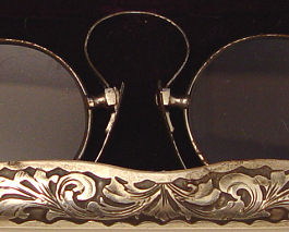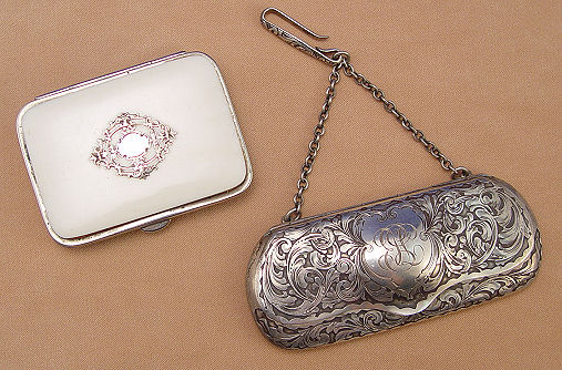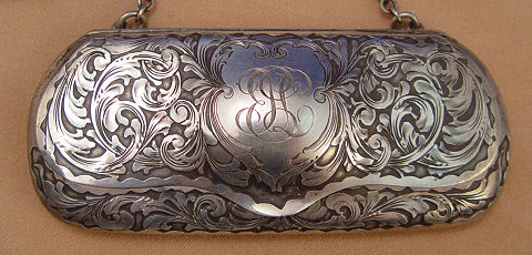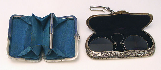 2 PC LOT TO INCLUDE AN IVORY PANEL COIN PURSE AND STERLING SPECTACLE CASE WITH PINCE-NEZ: Coin purse with ivory panels to sides, front panel with scroll framed medallion for monogram, leather? and silver tone metal purse with blue satin? multi pocket interior, no mark found, pressure clasp plus inside flip clasp to one section, approx. 2 3/4'' x 2'' x 1/2''. La Secla, Fried & Co (Newark NJ 1909-1915) spectacle case, etched foliate design, center monogram to lid JEL?, lovely royal purple velvet interior currently holding a pair of pince-nez. Approx. 4'' x 1 1/4'', plus a 2'' chain and 1 1/4'' hook to attach to your belt. Sold as a lot.
