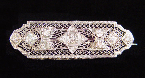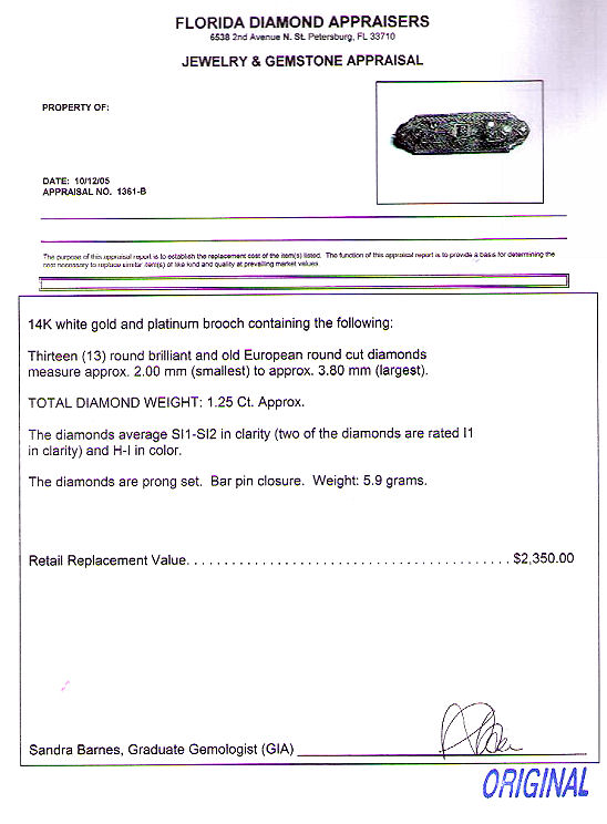 1.25CTW DIAMOND BAR PIN: Filigree bar pin of 14k white gold set with 13 round brilliant and old Euro cut diamonds, H-I color SI1-I1 clarity, signed 14k 3M, 2''l., 5.9 grams. Sold with current GIA appraisal, retail replacement value $2,350.00.