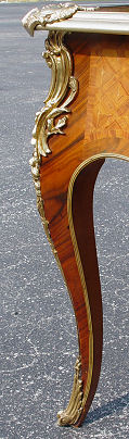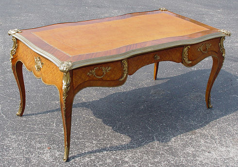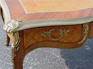 FRENCH LOUIS XV STYLE ORMOLU BUREAU PLAT: Satin wood veneer with shaped leather top framed in heavy ormolu, ornate ormolu mounts on the cabriole legs. Three drawers across the top. 32 1/2''h. with a 6' x 4'2'' surface. Later 20th C.