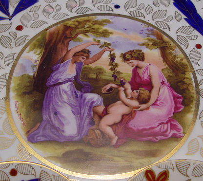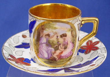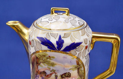 CZECH PORCELAIN COFFEE SERVICE ON TRAY: ''Modern'' pattern, the set includes large tray, 18''l., pot, cream pitcher, covered sugar, and 5 gold lined cups and saucers. Each of the pieces centers a scene of classically draped women.