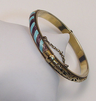 SILVER FILIGREE AND GUILLOCHE BANGLE BRACELET: A solid bangle of silver topped by two open work floral sections and two enameled sections. One enamel section of green flowers the other of textural blue and purple waves. Marked Silver, approx. 3'' dia., 22 grams.