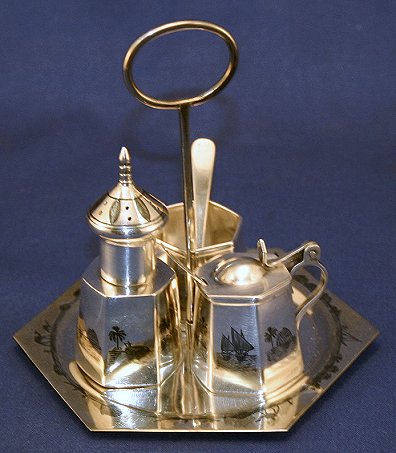 NIELLO CONDIMENT SET: Complete with a spice shaker 3''h, open bowl 1 1/4'' and honey pot with hinged lid, 1 3/4''h overall, on a matching handled tray, 4 1/4''dia. x 4 1/2''h., each with a tiny spoon. No marks found. All with ebony incised decor of Arabian scenes of camels and boats.
