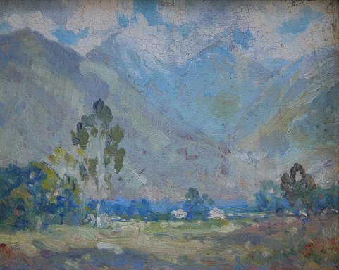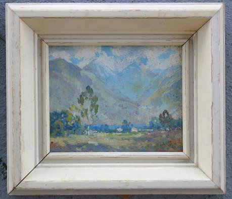 EXCEPTIONAL MINIATURE PLEIN AIRE LANDSCAPE: Possibly Tetons scene, O/B, 4 1/4'' x 5 1/4'', no visible signature, worn white frame, 6 3/4'' x 7 3/4''.