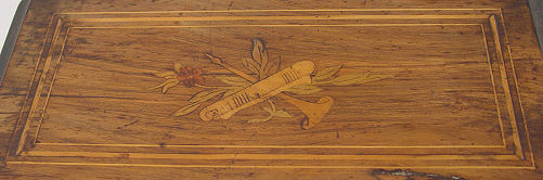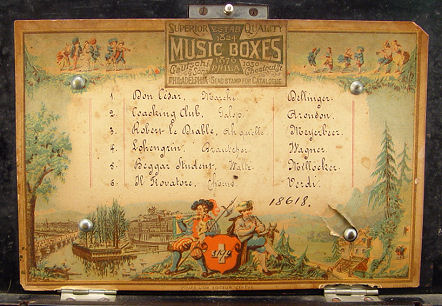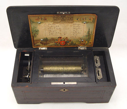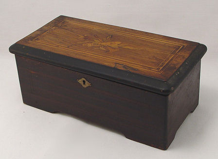 GAUTSCHI & SONS CYLINDER MUSIC BOX: Musical motif inlay case, plays 6 tunes, Gautchi & Sons heavy paper label identifying the songs, probably a Swiss box retailed by Gautchi, in working condition. 4 1/2''h. x 11 1/2'' x 6 1/2''.