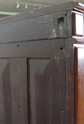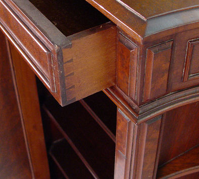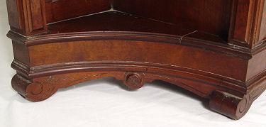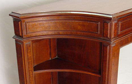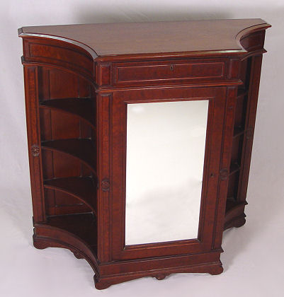 MAHOGANY CONSOLE CABINET: Open curved side shelves centering a mirror front door and drawer, 44'' h. x 44'' x 18''.