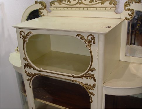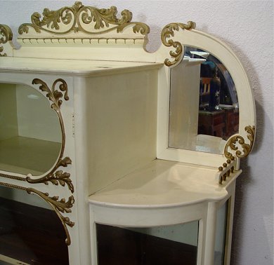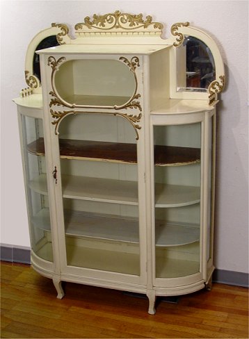FABULOUS TURN OF THE CENTURY OAK BOW SIDED CURIO DISPLAY CABINET: Just take off the painted and gold finish for the original splendor. Bow sides, straight front with beveled side mirrors. Original shelves. 60''h. x 54'' x 18''.