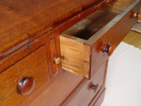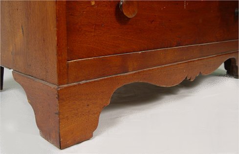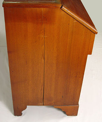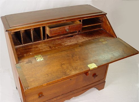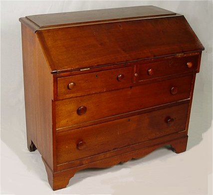 EARLY SLANT FRONT DESK: Interior of drawers and pigeon holes, single center slide support, three full length drawers with upper drawer overhanging lower two, shaped base. 36''h. x 39'' x20 1/2''.