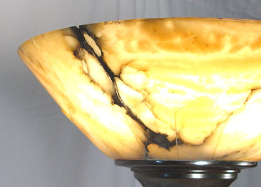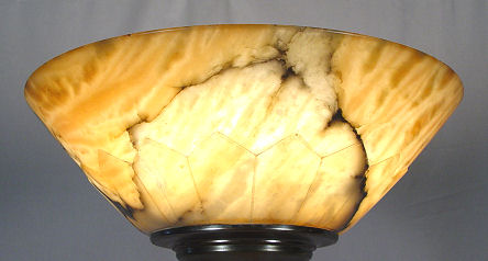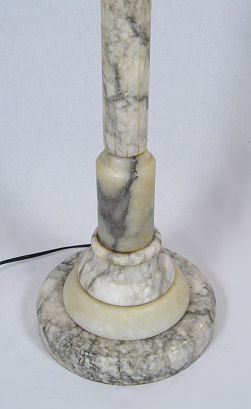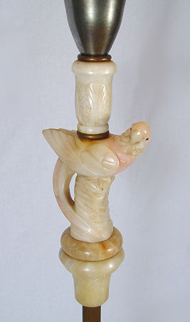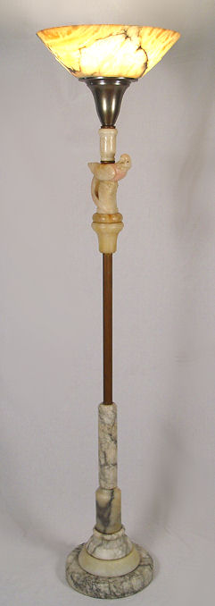 ART DECO MARBLE AND ONYX TORCHIERE LAMP: Floor lamp featuring carved bird on the stem, dome shaped marble shade and tiered marble at the base. 66''h., the shade is 16'' dia. Please call for condition.