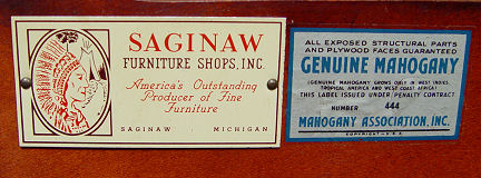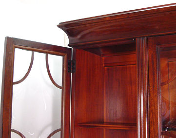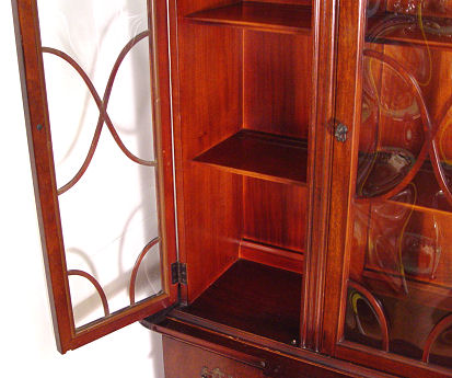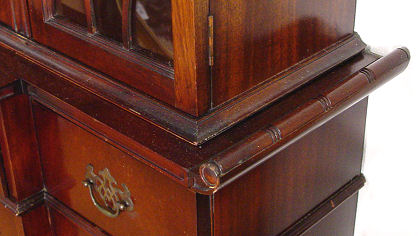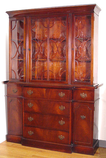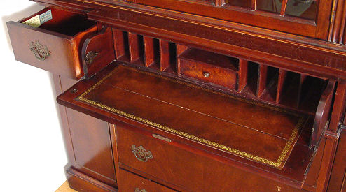 MAHOGANY SECRETARY CHINA CABINET BY SAGINAW FURNITURE: Bubble glass on the door fronts, lower section is fall front secretary with interior cubicles and leather surface. 75''h. x 54''w. x 14''.