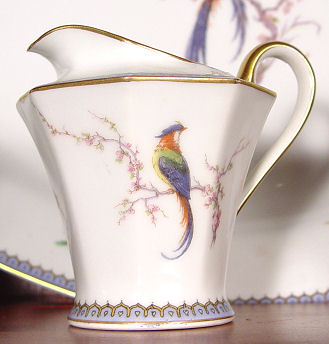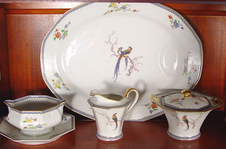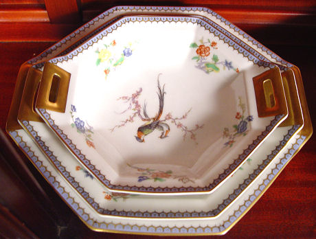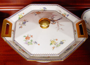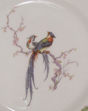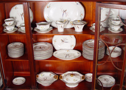 THEODORE HAVILAND FRENCH LIMOGES CHINA SERVICE IN THE ''PARADISE'' PATTERN: Ca. 1904- mid 20's. Approx. 65 pieces to include 11 dinner plates, 13 luncheon plates, 13 bread plates, 4 salad plates, 6 soup bowls, 6 cups and saucers, 3 dessert bowls, 3 graduating serving bowls, cream pitcher, covered sugar, gravy boat, an 11''platter with juice well and a 15'' platter with juice well.
