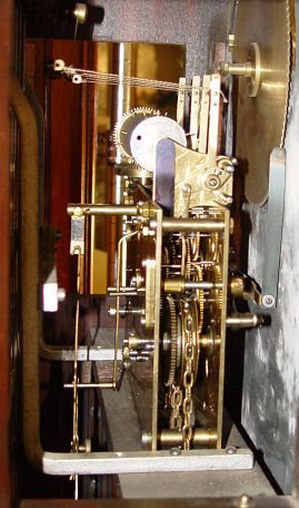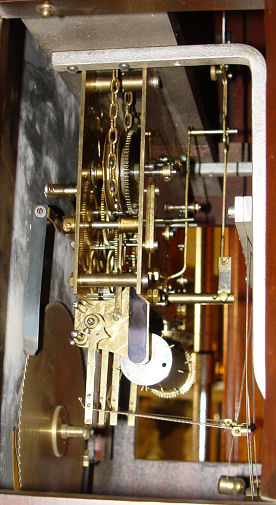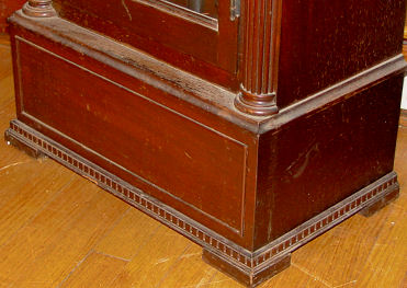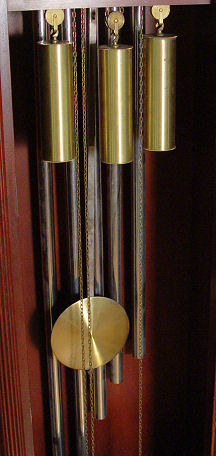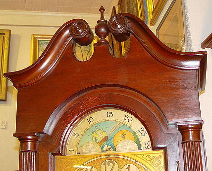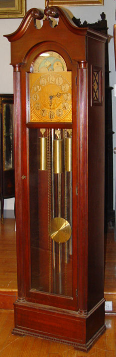 MAHOGANY FINISHED CHIMING TALL CASE CLOCK: Topped by a broken pediment with center ball finial, three weights, five pipes, some pealing on moon phase dial, reeded column stiles, straight skirt with dentil trim, approx 81 1/2''h., 21''w., 12''d.