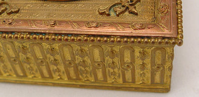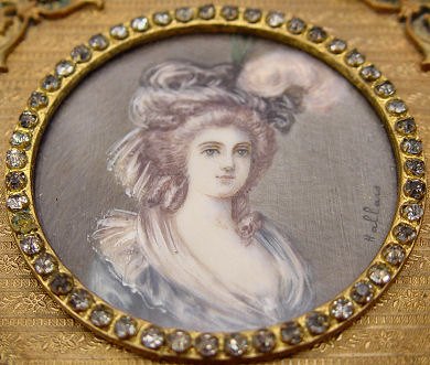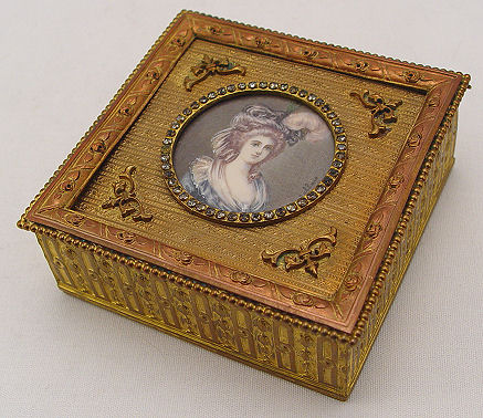 GILT TRINKET BOX WITH MINIATURE W/C PORTRAIT: Small square box of gilt tone metal with bellflower columns to sides and band of roses to lid. Lid centered by miniature painting of lovely lady, signed Hallars?, framed in ring of rhinestones (missing one). Inside box, the lid lining is glued in place, satin cushion to bottom also attached, normal wear to bottom. No mark found, approx. 3 1/2''square and 1 1/4''h.