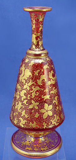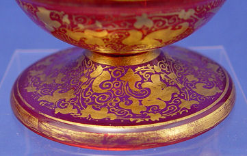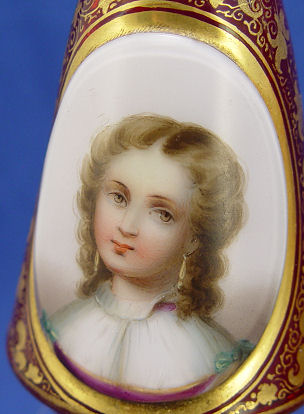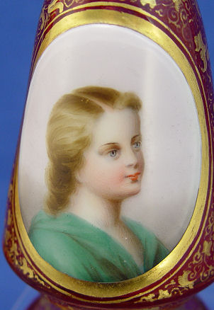 PAIR OF MOSER CRANBERRY GLASS PORTRAIT VASES: All over gold lacey decor, each with a portrait of a different girl. One has an Ovington Bros. retailers paper label. 6 3/4''h.
