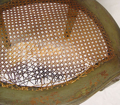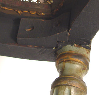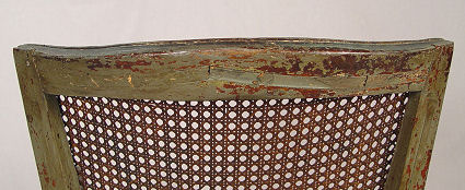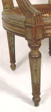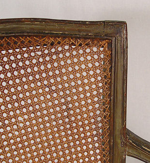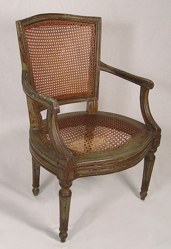 EARLY LOUIS XVI STYLE OPEN ARMCHAIR: Cane back and seat, mortised and pegged construction, older ''shabby'' green paint with traces of gilt. Cane seat will need to be replaced. 36''h. x 24 1/2''w.