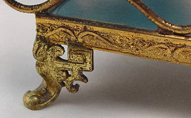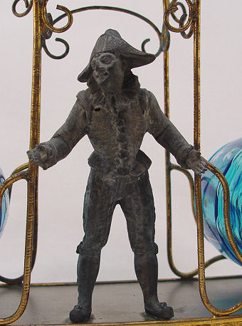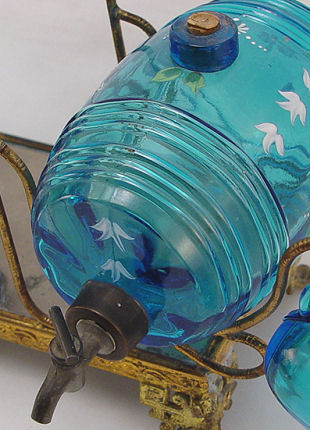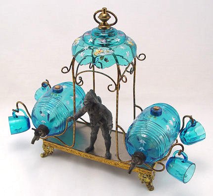 VICTORIAN ART GLASS LIQUEUR DECANTER IN HARLEQUIN FIGURAL STAND: Hand enamel decoration on the barrel form decanters with spigots, the 4 miniature mug cordials, and glass pergola top. The stand is gilt metal with a 5'' tall spelter harlequin. Overall 12''h. x 13'' x 6''.