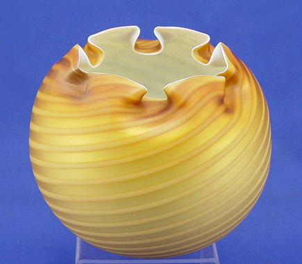STEVENS & WILLIAMS POMPEIIAN SWIRL GLASS ROSE BOWL: Victorian mother of pearl satin glass rose bowl with pleated rim, 4 1/2''h., 5 1/2'' dia. at widest. Excellent condition.