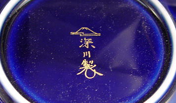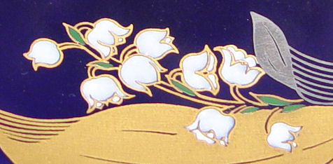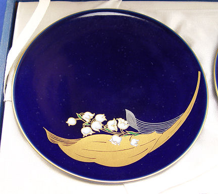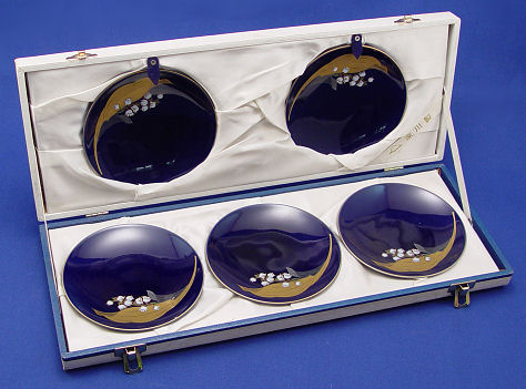 5 FUKAGAWA PLATES IN ORIGINAL PRESENTATION BOX: Enameled lily of the valley decor on cobalt ground, each plate is 4 3/4'' dia. Original satin lined presentation box.