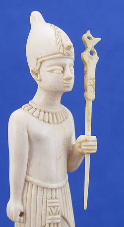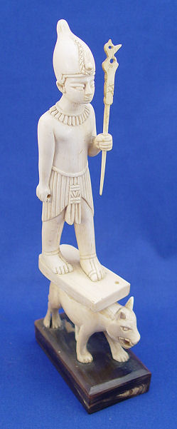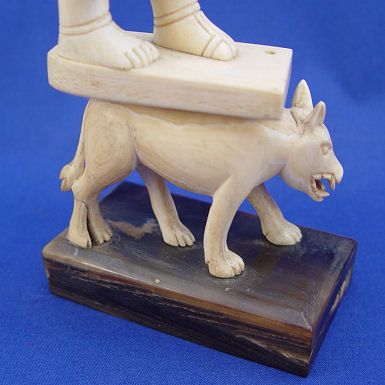 CARVED IVORY EGYPTIAN FIGURE: Classic Egyptian figure on plinth supported by a dog. 3 piece construction mounted on carved horn base. 10''h. overall, ivory is 9'' h. Please call for condition.