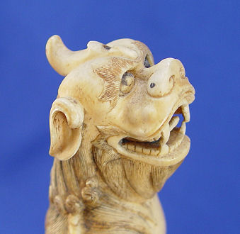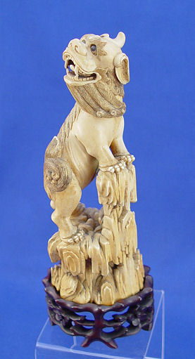 CHINESE CARVED IVORY FOO DOG OR LION: Fine rendering of a Chinese classic raised on hind legs, natural aged patina, fine details, ivory is 6 3/4''h, custom carved wood base adds 1 1/2''h.