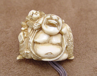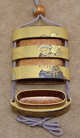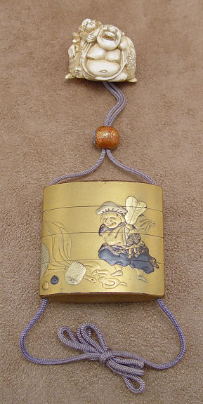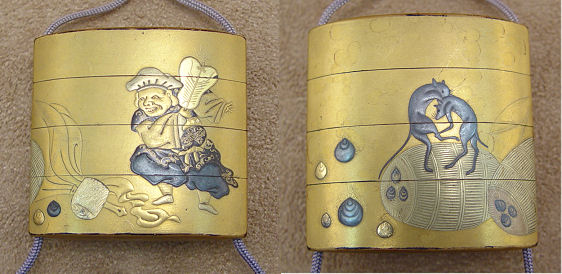 JAPANESE INRO AND IVORY NETSUKE: Gold lacquer four case inro decorated with man watching rats dance, 2 1/4''h. The carved ivory netsuke is 1 1/4''.