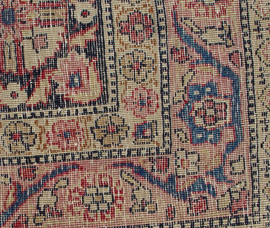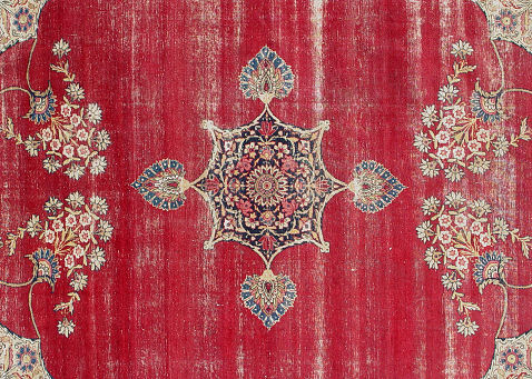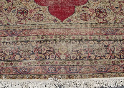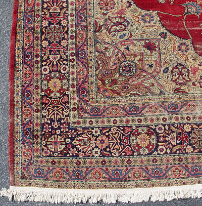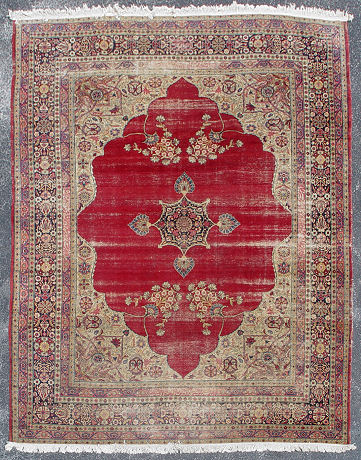 HAND WOVEN ORIENTAL RUG: Red ground, approx. 11'4'' x 8'7'', very worn condition.