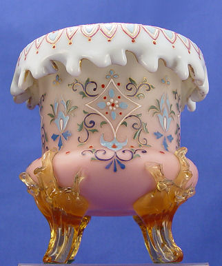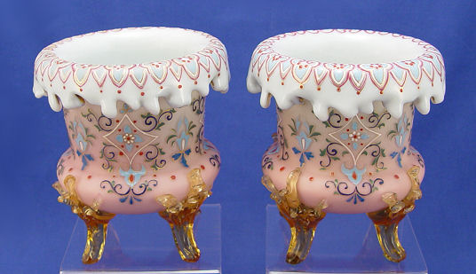 PAIR OF THOMAS WEBB ENGLISH VICTORIAN ART GLASS CACHE POTS: Layered glass in unusual form with rolled edge, heavy enamel decoration, applied amber rigaree feet. 5 1/4''h, 4 1/2'' dia.