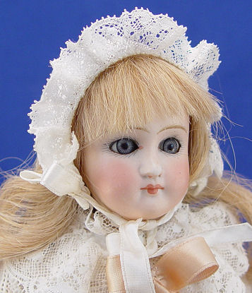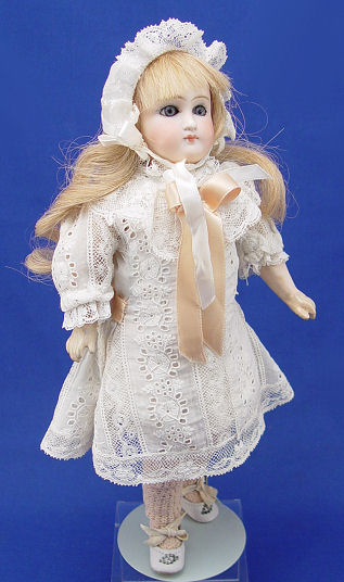 BELTON FRENCH BISQUE DOLL: Mold number 1, as marked on back of the neck. Bisque head with long blond human wig, beautiful blue glass eyes, painted features, composition over wood jointed body and jointed limbs, dressed in vintage white eyelet, tall stocking and shoes. 11''h.