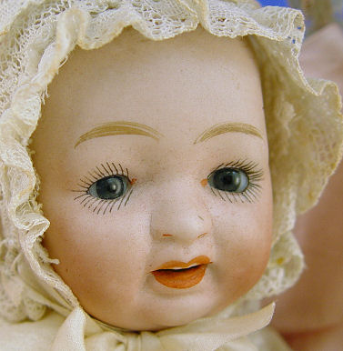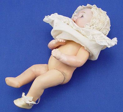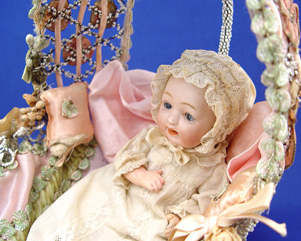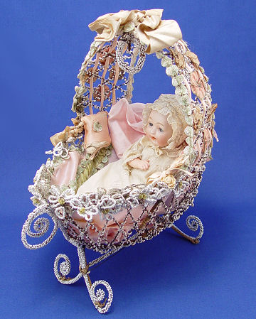 HEUBACH GERMAN BENT LIMB BABY DOLL IN VICTORIAN BEADED BASSINET: First the doll- Bisque head baby with painted hair, brows and lashes, open mouth, bent limb composition body, dressed in baby gown, bonnet, and satin shoes, marked 3 3/0 ?. 8''l. The Victorian baby bed is hand crafted from wire, beads, ribbon flowers, satin and velvet ribbon, 13''h. x 12''l. Display dome is included.