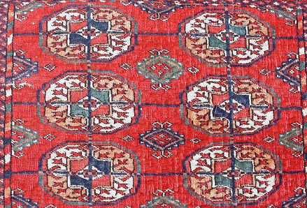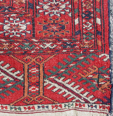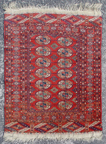 SEMI- ANTIQUE HAND TIED TURKOMAN ORIENTAL RUG: Approx. 3'1'' x 3'8'', all wool, Tekke Bokhara design, semi-depressed warp threads, approx. 140 knots per square inch. Ca. early 20th Century. Worn condition.