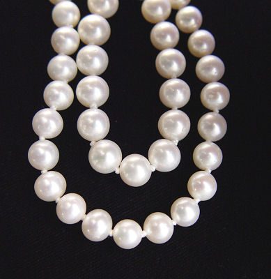52'' STRAND OF 7MM CULTURED FRESH WATER PEARLS: Creamy white pearls double knotted for security, 14k yellow gold clasp.