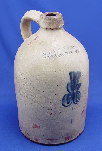 E & LP NORTON BENNINGTON VERMONT STONEWARE JUG, CA 1861-1882: Edward and Luman P. Norton, Bennington, Vermont. Cobalt blue decoration, salt glaze jug. Age appropriate wear, with no cracks. 12''h.