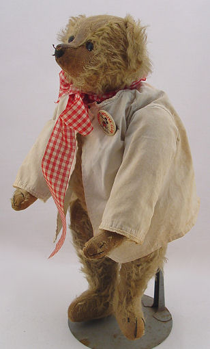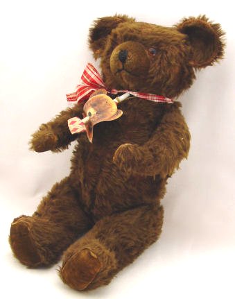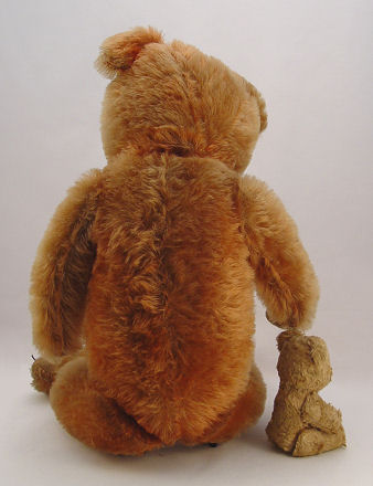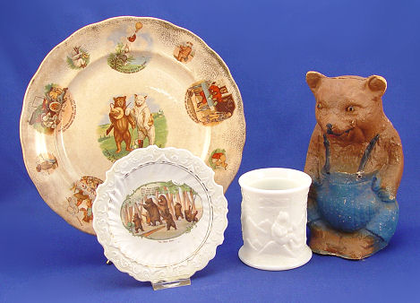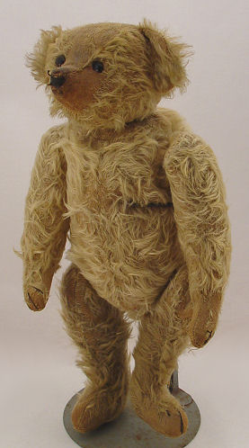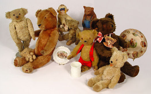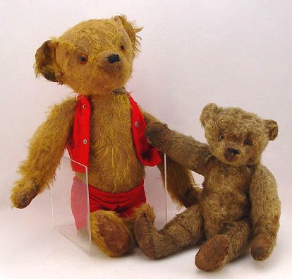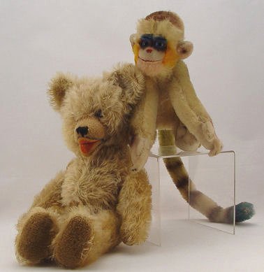 ESTATE COLLECTION OF VINTAGE TEDDY BEARS AND A MONKEY: By consignor request, this grouping of bears and bear memorabilia is to be sold together as a lot. There are 7 teddy bears, all are early 20th C, jointed, with varying degrees of wear. The smallest is 6''h, the tallest is 25''h. The paper mache' bear bank is 8''h. The Shuco monkey still has his ear button. The Roosevelt Bear plate by Buffalo pottery is 10'' dia. (discolored), the 6'' plate has a scene of bears in hunting garb. Bear milk glass spooner. Lot to include early Steiff and more.